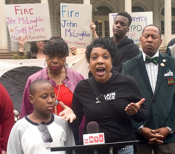 Malcolm announced that she is suing New York City for unreleased documents related to the killing of her son. Councilman Andy King; Gwen Carr, mother of Eric Garner; Gideon Oliver, civil rights attorney and former president of National Lawyers Guild NYC Chapter; Communities United for Police Reform; and others stood by Malcolm’s side on the steps of New York City’s City Hall as she addressed the media on the unjust killing of her son.