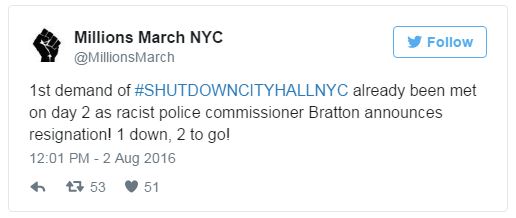 Protesters from the group Millions March had called for Bratton's resignation on Monday and earlier on Tuesday, as well as for the defunding of the NYPD, reparations to the victims of police brutality and the abolition of all police and prisons. The group celebrated the resignation news on Twitter.
