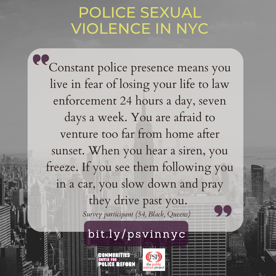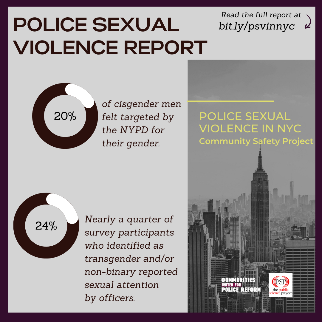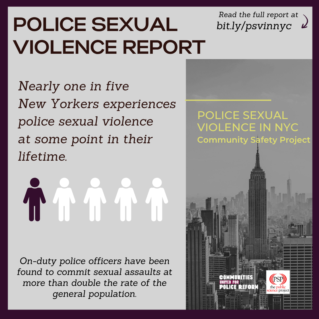 The Police Sexual Violence in NYC report is the most comprehensive study of its kind on police sexual violence in New York City and exposes the pervasive nature of the police sexual violence crisis in New York City.