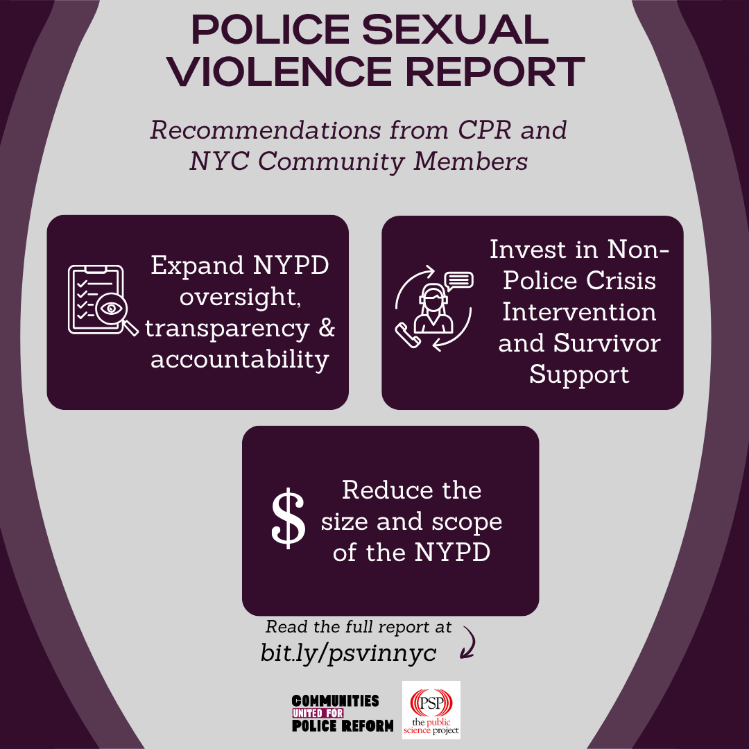 This report was led by CPR grassroots members, in coordination with the Public Science Project at the CUNY Graduate Center, and its are the result of community town hall meetings, a survey administered to over 3,700 New Yorkers in all five boroughs of the city, and thirty-seven in-depth semi-structured interviews with New Yorkers who have experienced police gender-based and sexual violence.